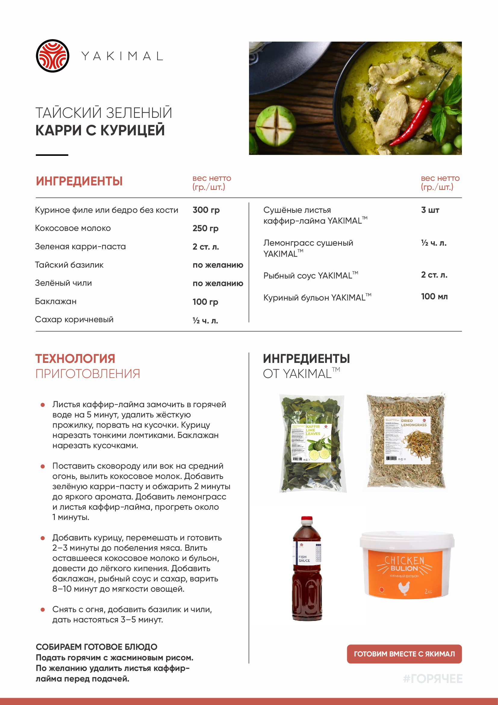 Подать горячим с жасминовым рисом. По желанию удалить листья каффир-лайма перед подачей.