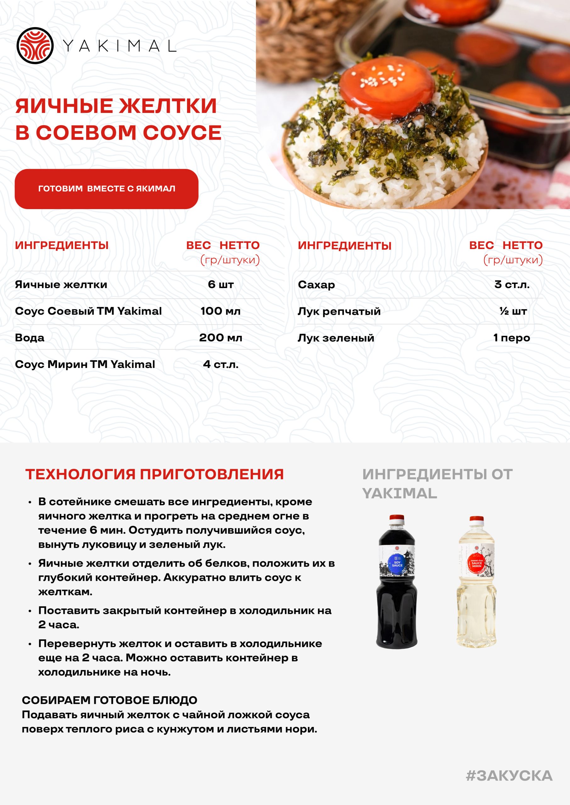 Подавать яичный желток с чайной ложкой соуса поверх теплого риса с кунжутом и листьями нори.
